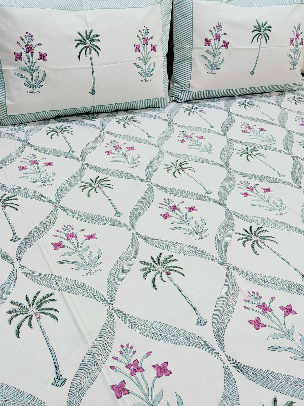 Blue Palm & Flower Block Printed Bedsheet (Fitted)